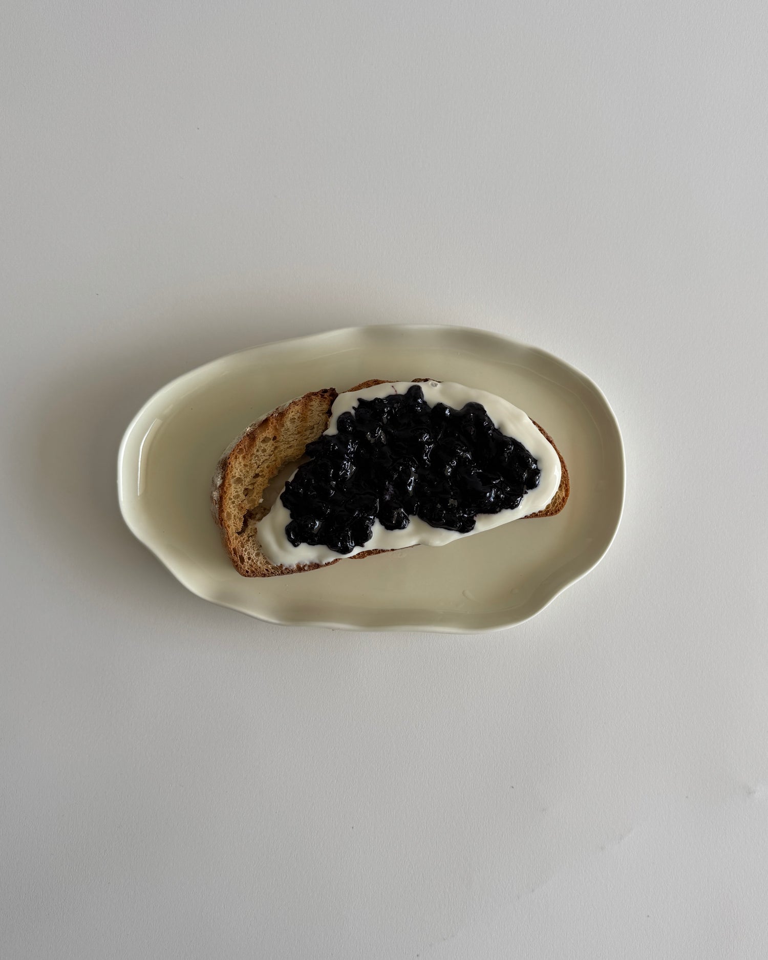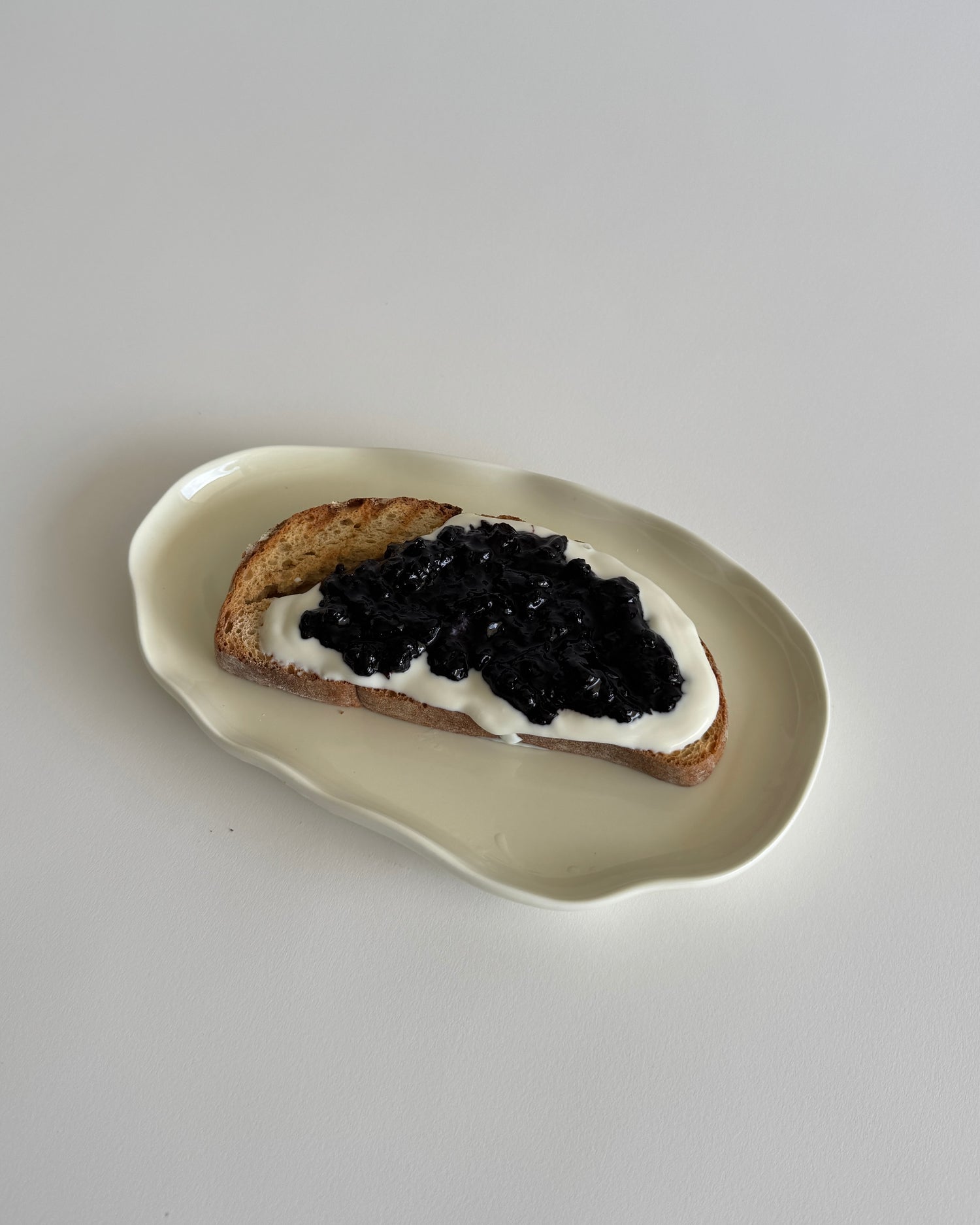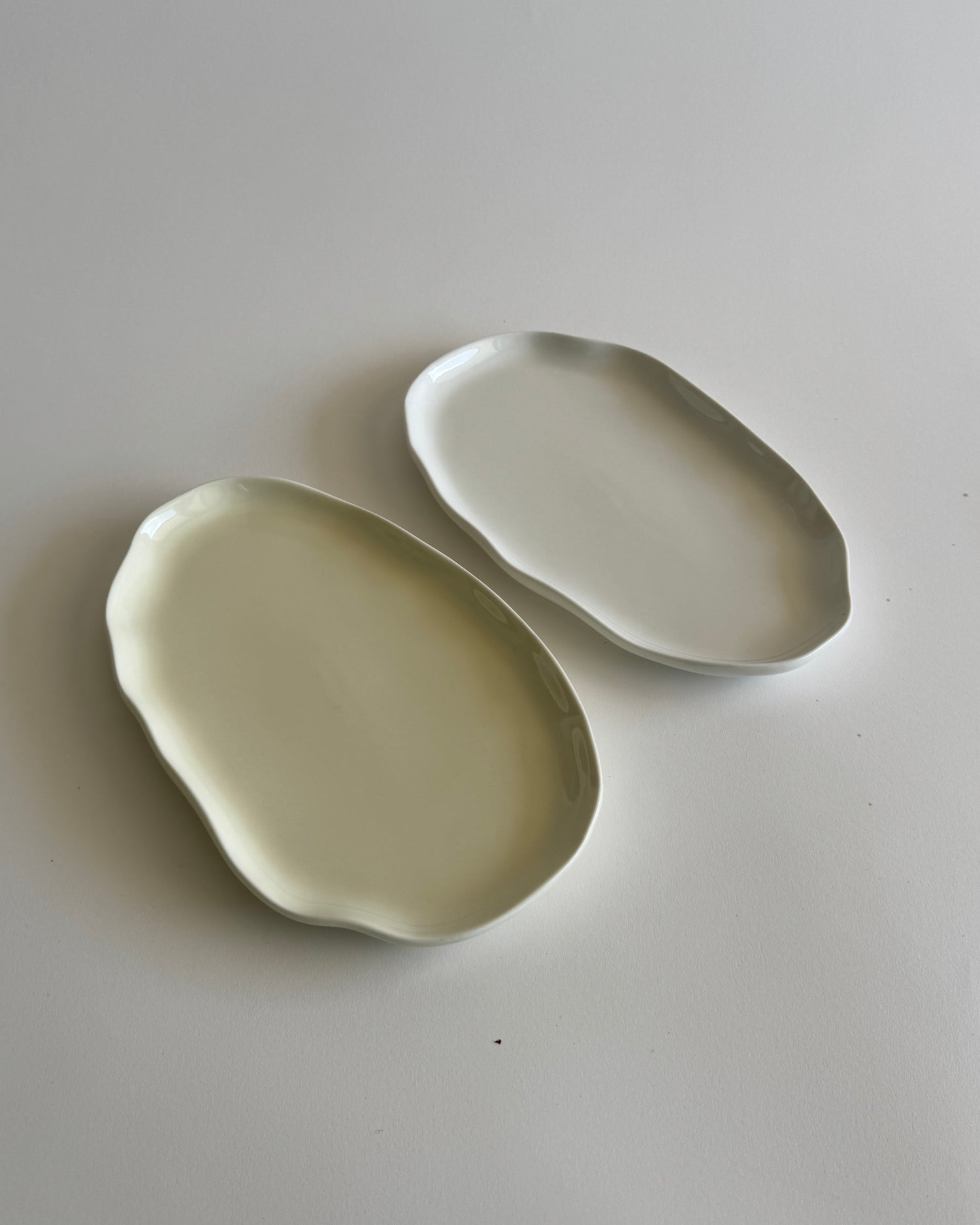 This plate stands out with its soft butter yellow glaze that brings warmth and subtle color to any table setting. the organic, slightly irregular shape gives it a modern yet timeless character, making each piece feel unique.