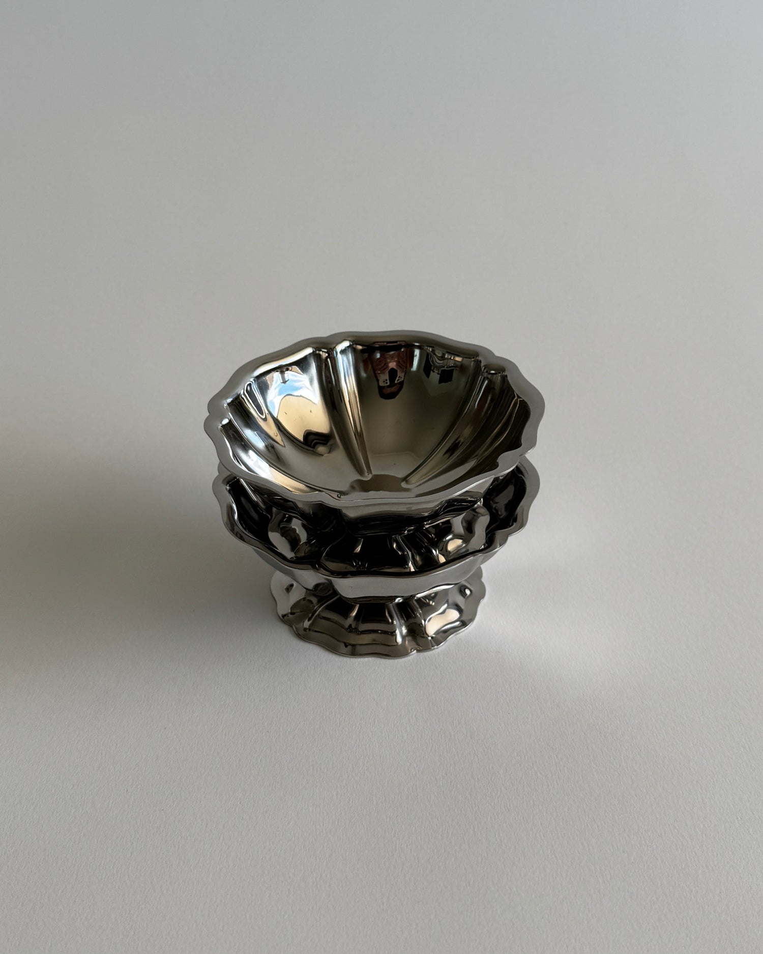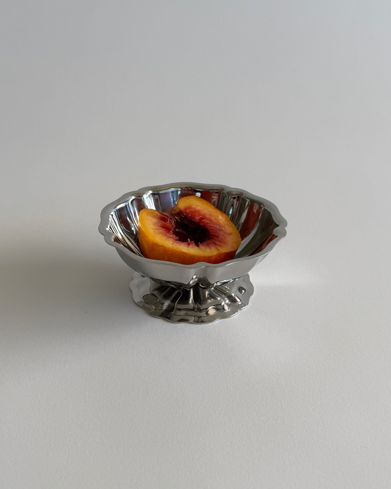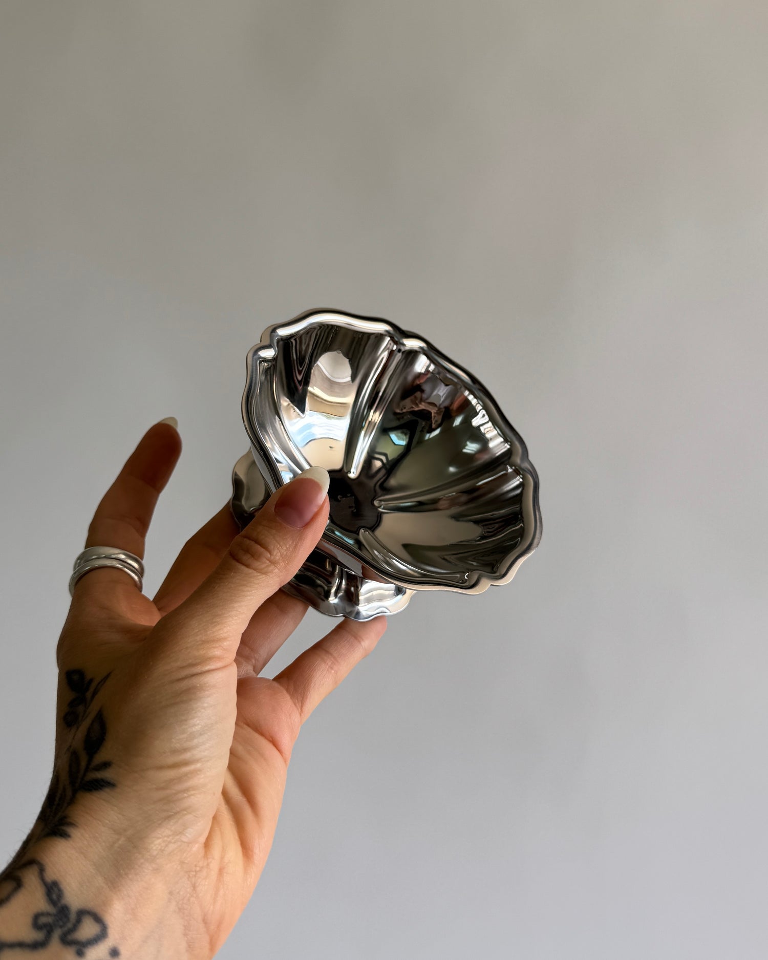 this compact pedestal bowl features a scalloped rim and a polished metal finish, combining elegance with everyday versatility. its raised base adds a refined touch, making it perfect for serving small treats, dips, or as a decorative accent for jewelry and trinkets.