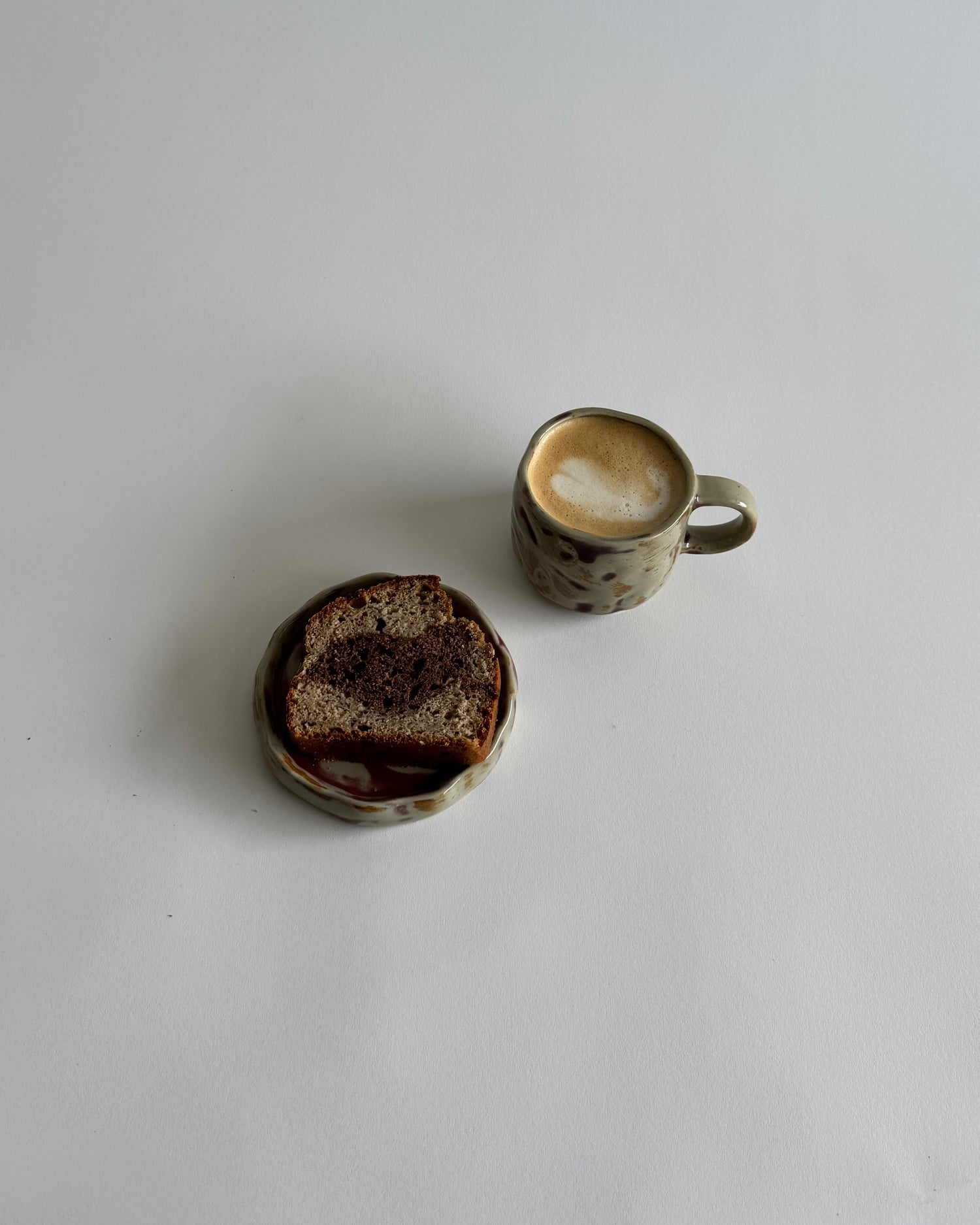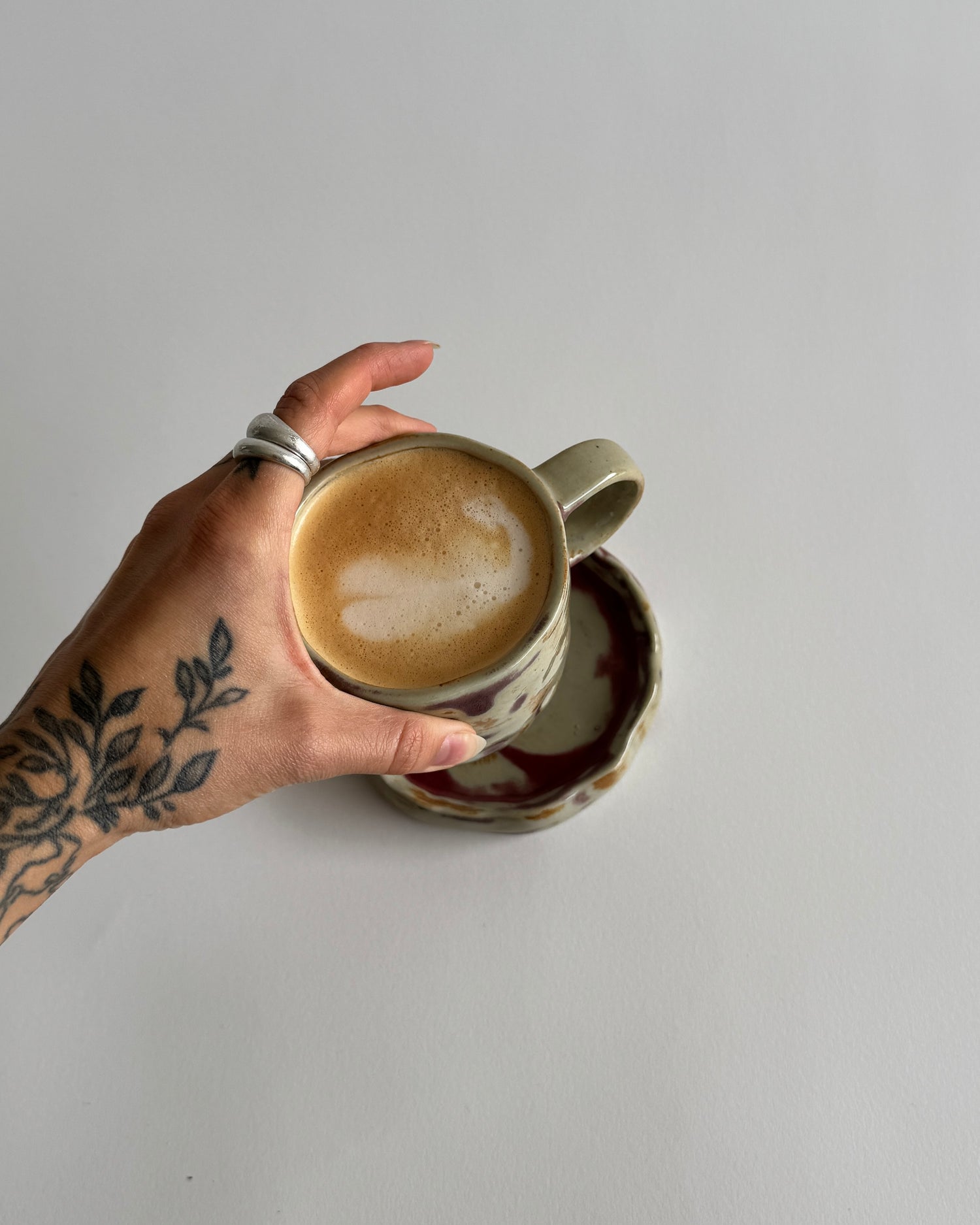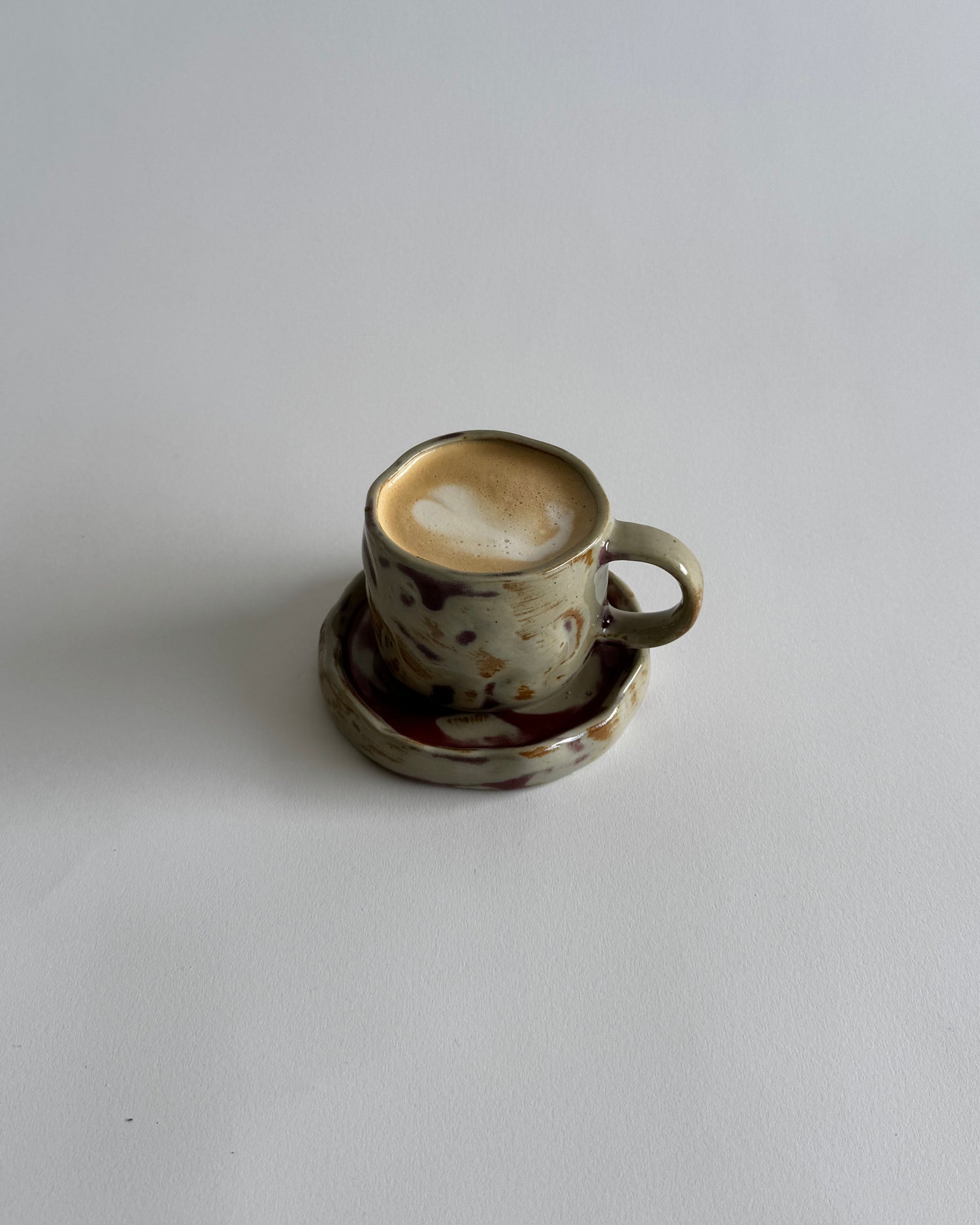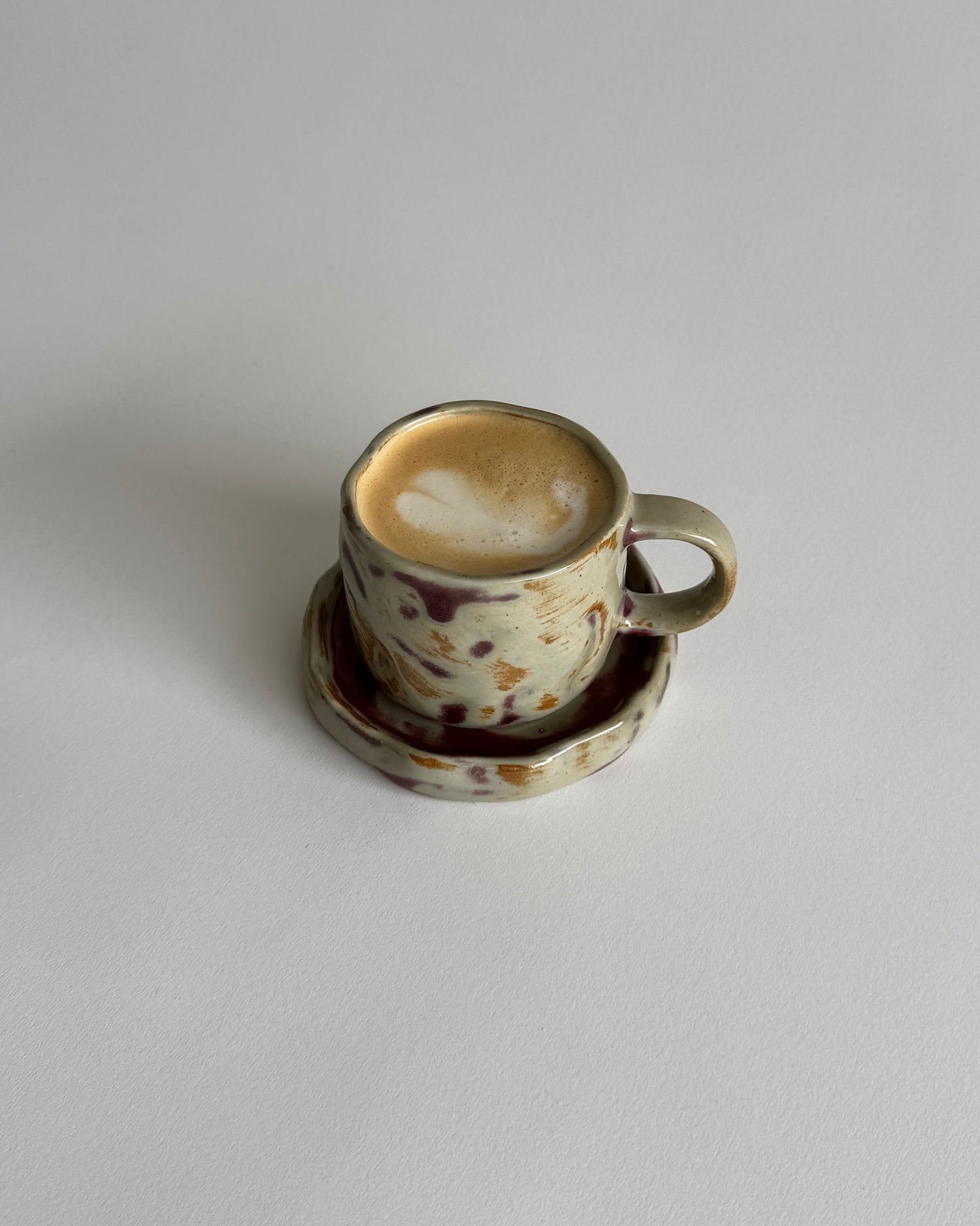 Featuring an organic shape and a playful glaze in earthy tones with hints of deep red and warm brown, it brings individuality and charm to your coffee ritual.