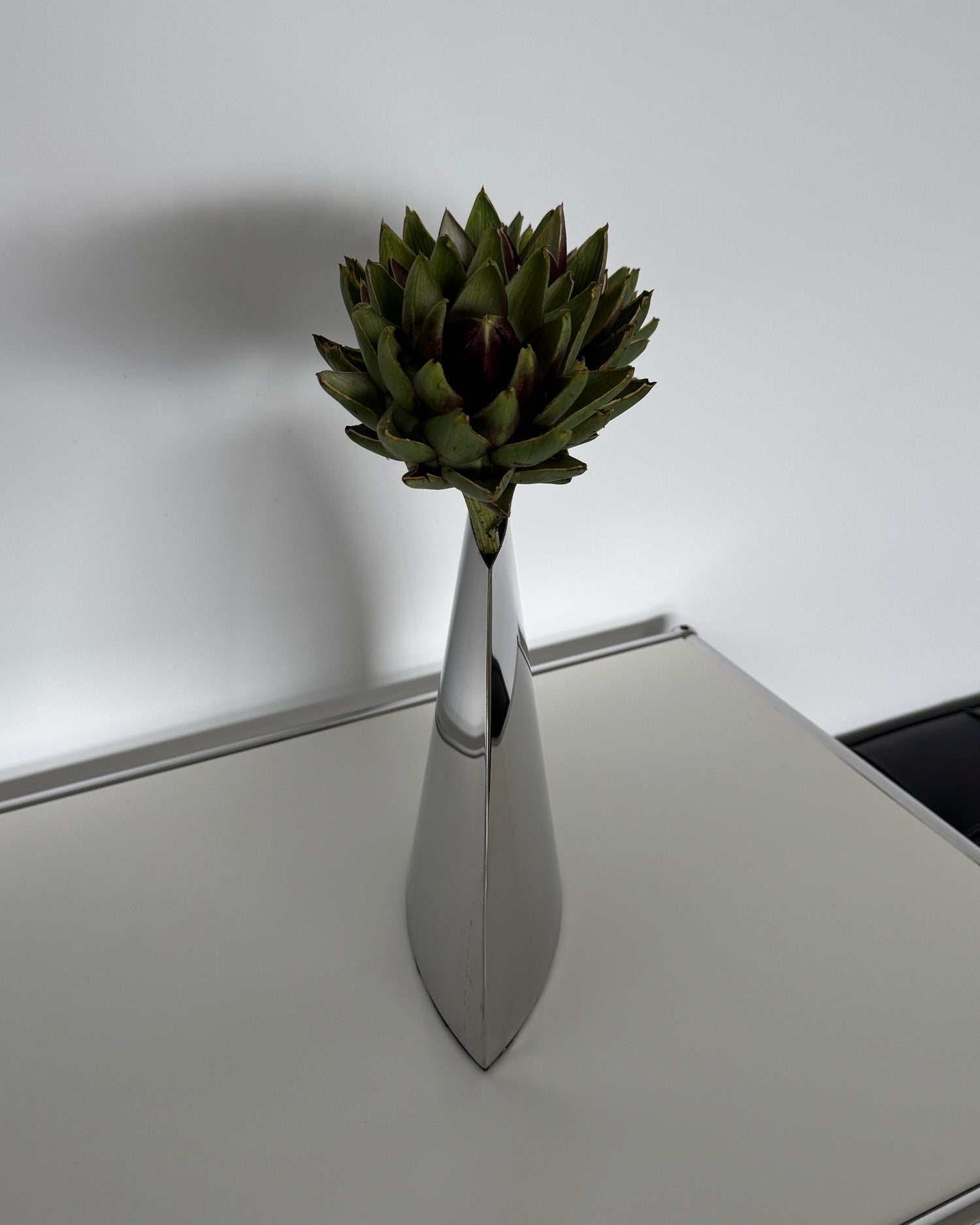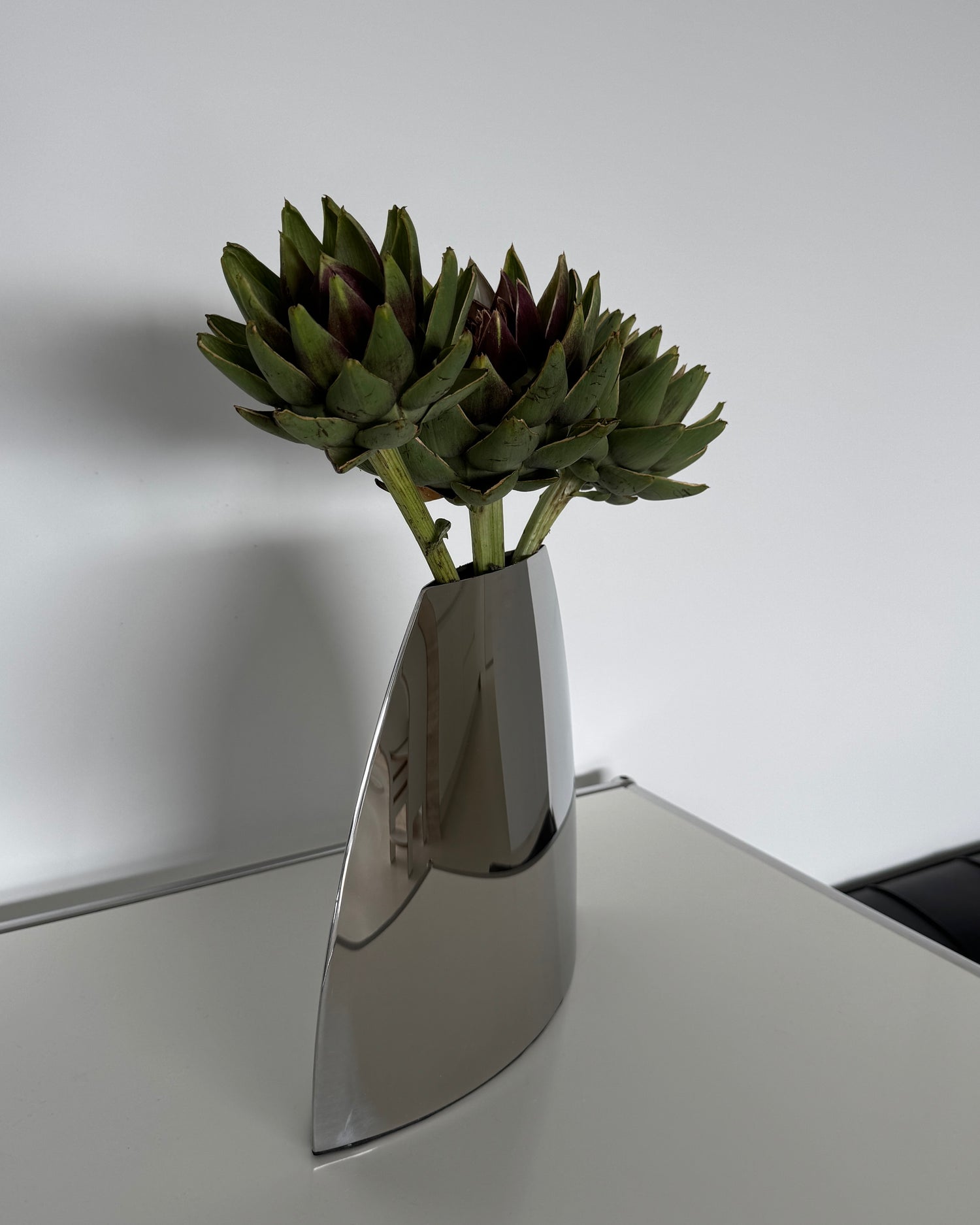 crafted from polished stainless steel, this vase combines bold geometry with a sleek reflective surface. its sculptural silhouette makes it not only a functional vessel for flowers, but also a striking design object on its own.